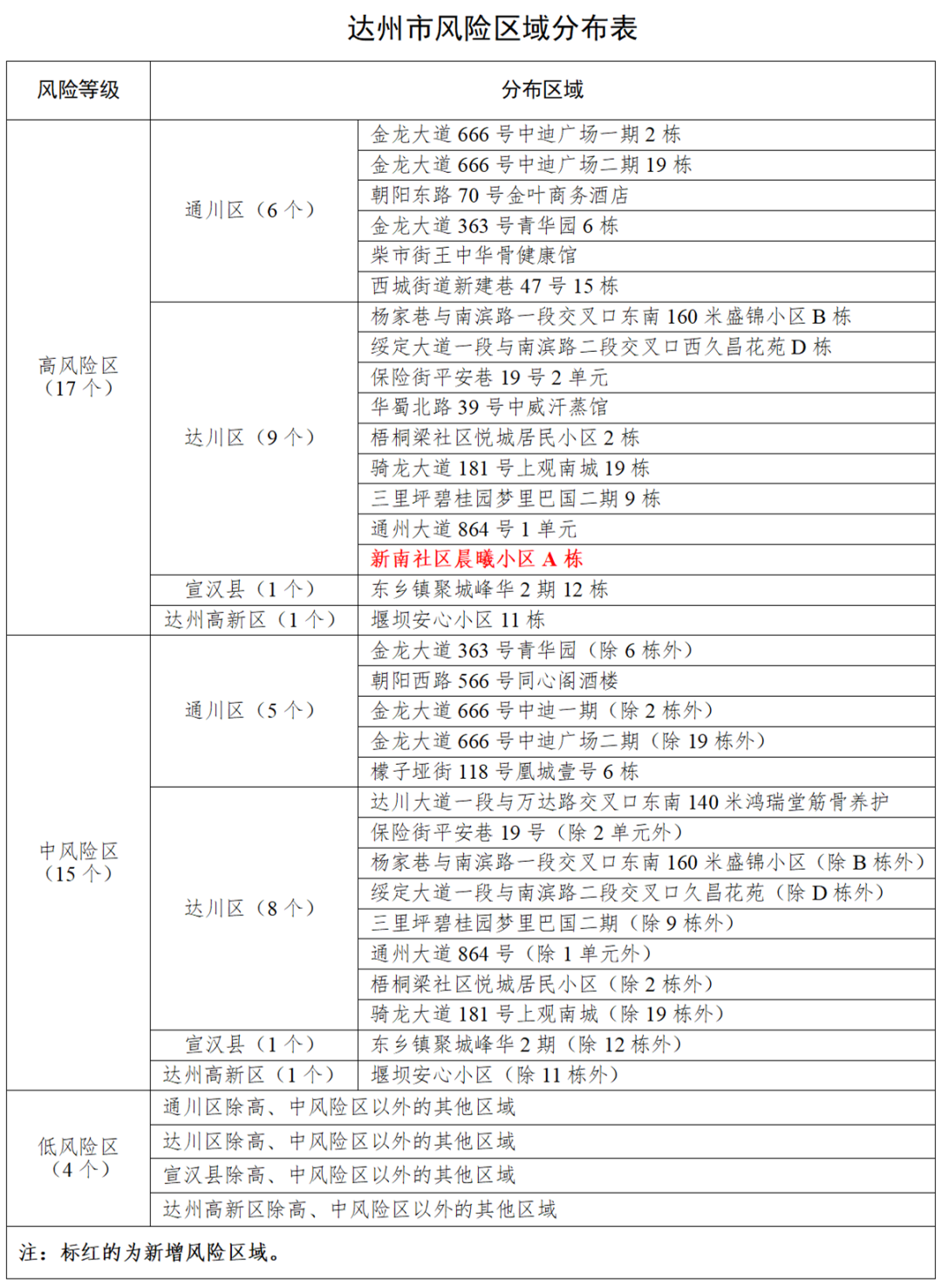 关于我市疫情风险区变化及管控措施相关情况,李敏表示,根据《新型冠状病毒肺炎防控方案(第九版)》规定,经逐级上报审核公布,目前我市高风险区为17个,其中昨日达川区新增1个。中低风险区数量及区域分布保持不变,高中低风险区疫情防控措施要求不变。(见附表)