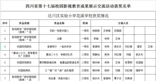 砥砺耕耘结硕果,弦歌不绝奏华章。近日,由四川省教育信息化与大数据中心(四川省电化教育馆)、四川省教育融媒体中心(四川教育电视台)联合举办的四川省第十七届校园影视教育成果展示交流活动评选结果揭晓。达川区实验小学花溪学校的7部作品在众多作品中脱颖而出,获得省一等奖3个、省二等奖2个、省三等奖2个。