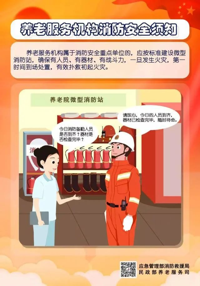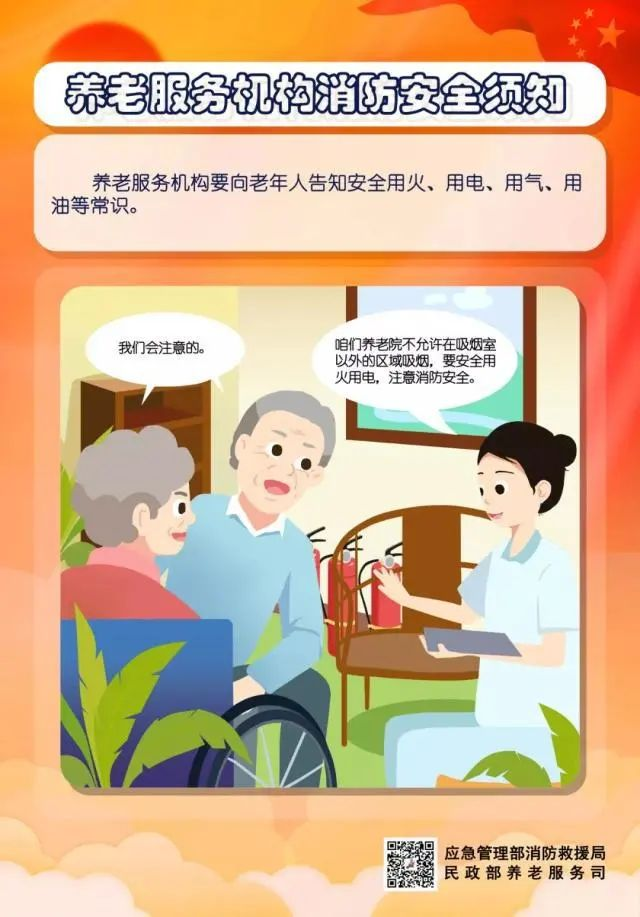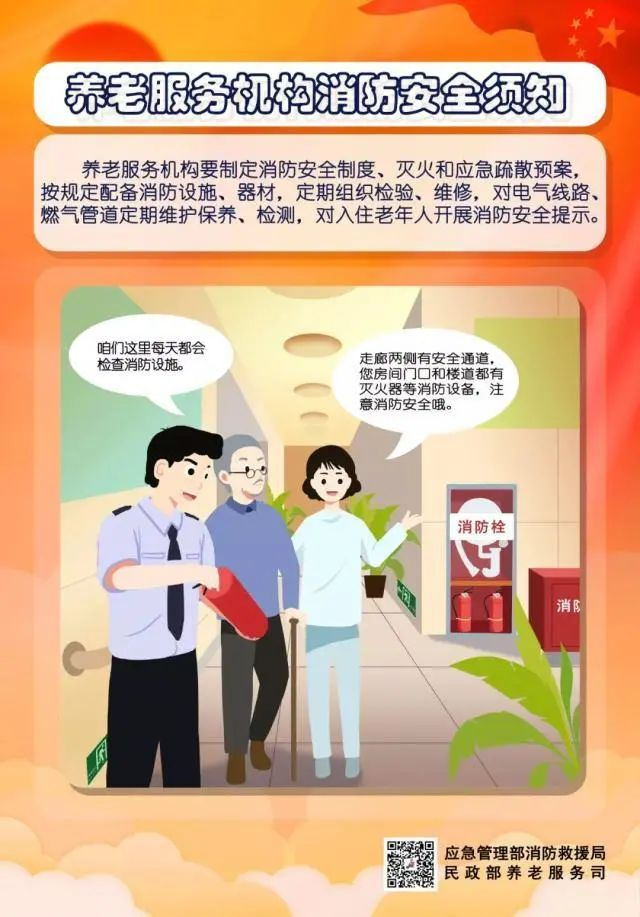 02 养老服务机构要制定消防安全制度、灭火和应急疏散预案,按规定配备消防设施、器材,定期组织检验、维修,对电器线路、燃气管道定期维护保养、检测,对入住老年人开展消防安全提示。