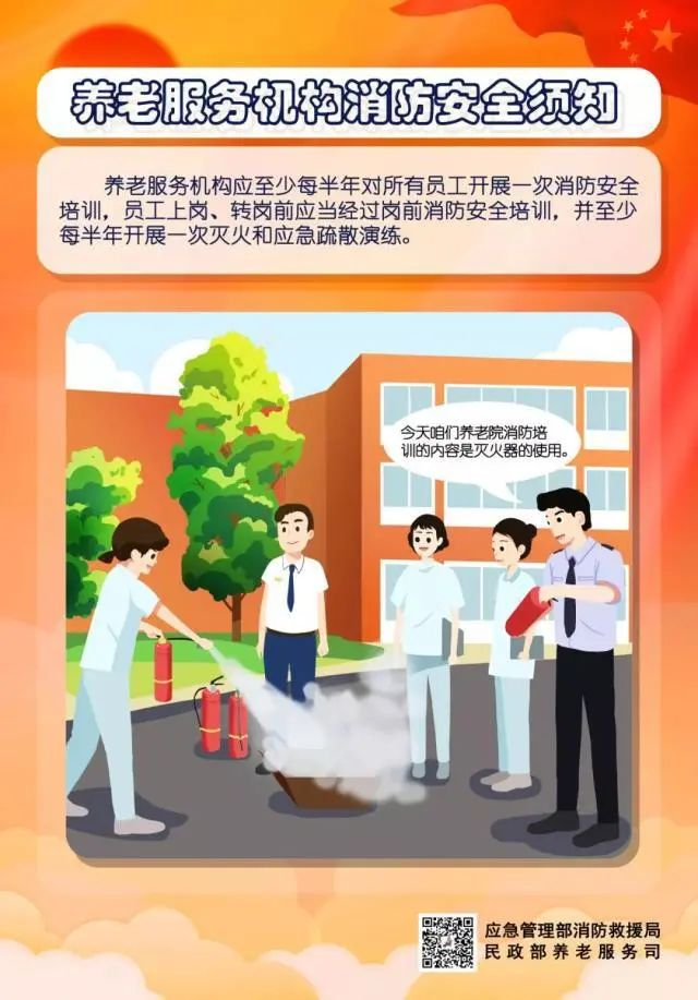 06 养老服务机构应当对所有员工每半年至少开展一次消防安全培训,员工新上岗、转岗前应当经过岗前消防安全培训,并每半年至少开展一次灭火和应急疏散演练。