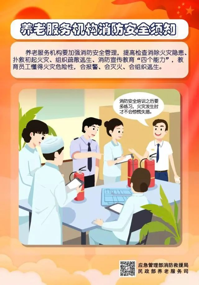 03 养老服务机构要加强消防安全管理,提高检查消除火灾隐患、扑救初起火灾、组织疏散逃生、消防宣传教育“四个能力”,教育员工懂得火灾危险性,会报警、会灭火、会组织逃生。