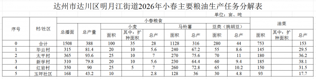 附件:达州市达川区明月江街道2026年小春主要粮油生产任务分解表