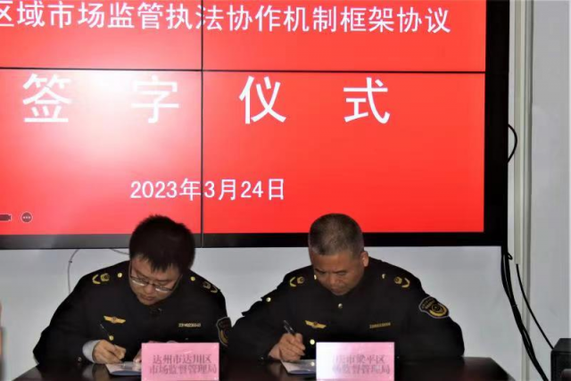 为有效提升川渝跨区域行政执法联动协同能力,构建精准有效的市场监督管理执法协作机制,3月24日,达州市达川区市场监督管理局安全总监王金率相关人员一行5人前往重庆市梁平区市场监督管理局,参加两局共同举办的区域协作座谈会。双方围绕创新合作机制、拓展合作范围、深化合作交流开展座谈,共同签署跨区域市场监管执法协作机制框架协议。